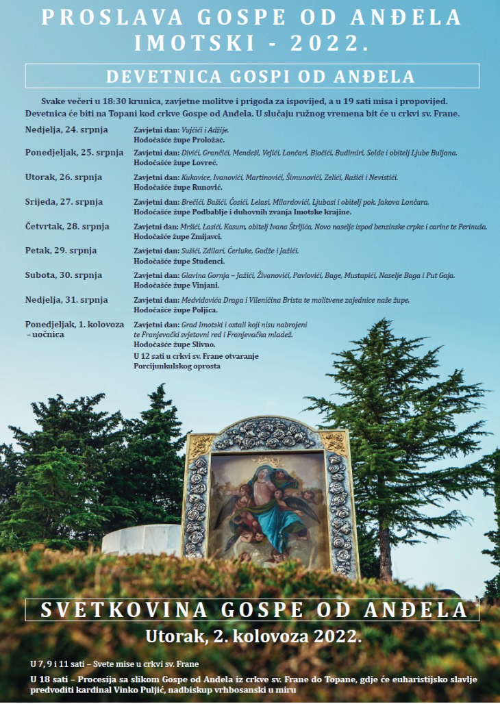 Svetkovina Gospe od Anđela, zaštitnice Imotskoga i Imotske krajine, ujedno Dan grada, bit će svečano proslavljena u utorak 2. kolovoza.