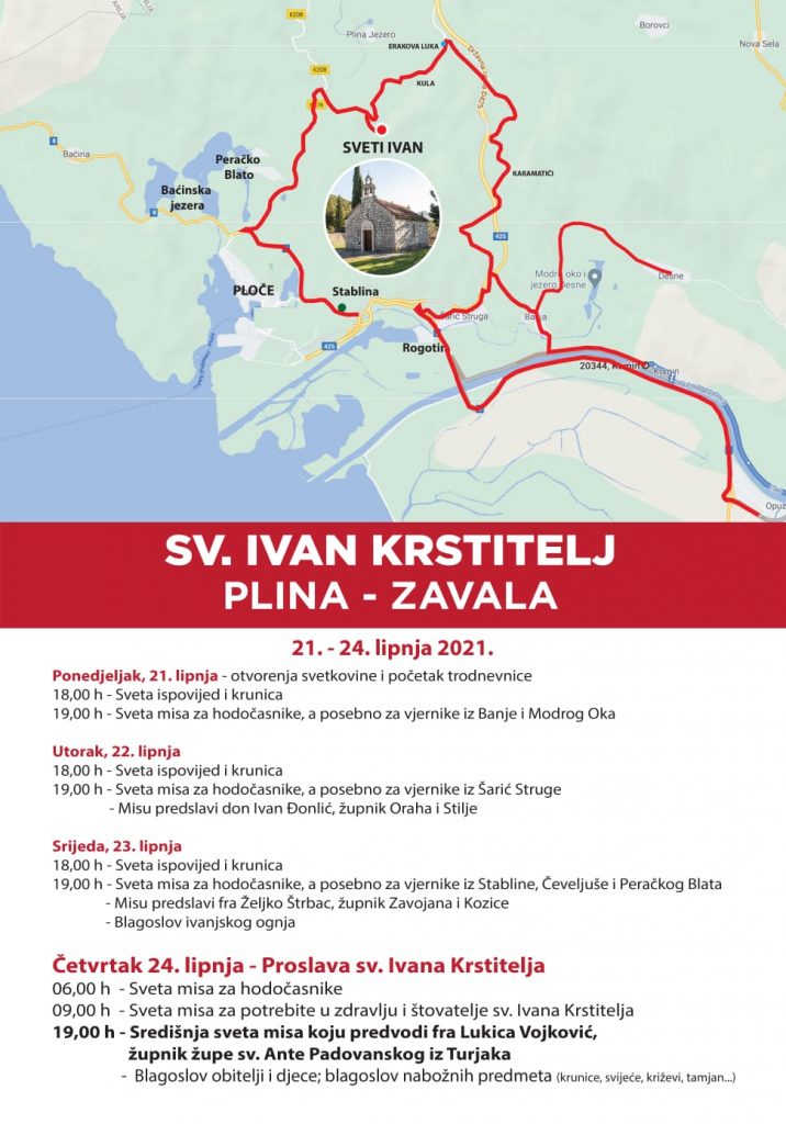 U četvrtak 24. lipnja ispred crkve sv. Ivana na Zavali u zapadnoj Plini svete mise su u 6, 9 i središnja u 19 sati koju predslavi župnik Župe sv. Ante Padovanskog iz Turjaka fra Lukica Vojković. Nakon mise je blagoslov obitelji, djece i nabožnih predmeta.