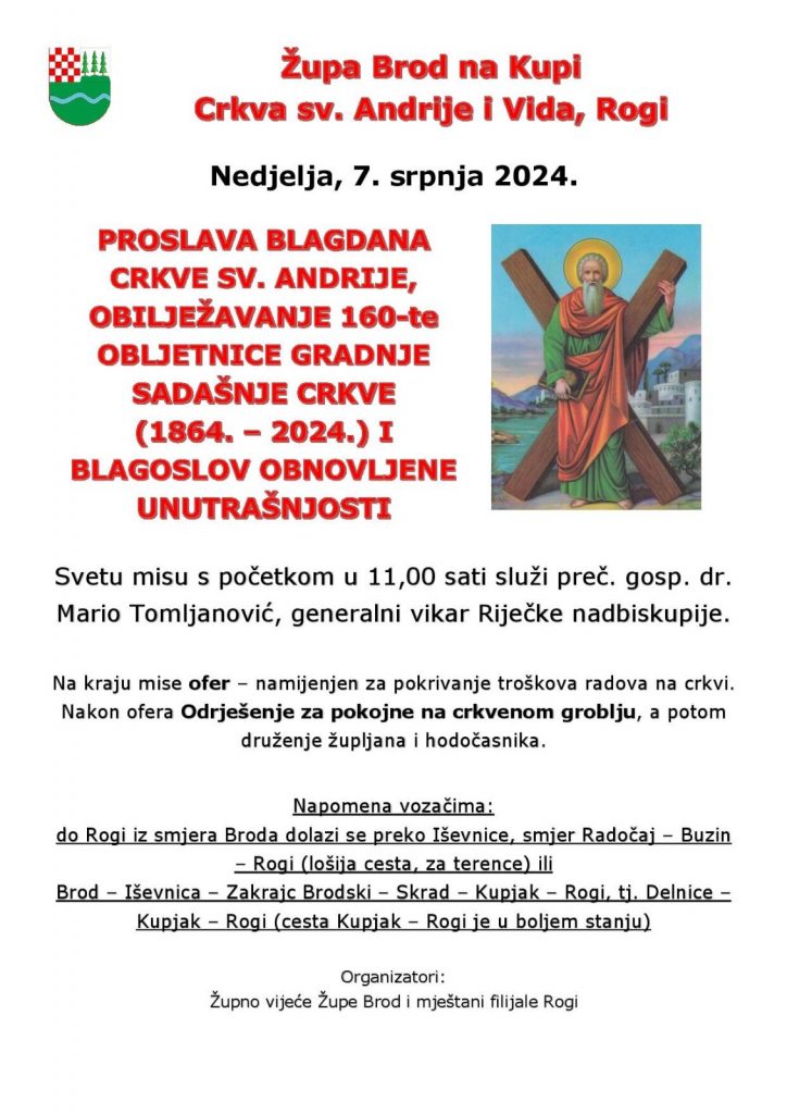 Svetkovina sv. Andrije, 160. obljetnica gradnje crkve i blagoslov obnovljene župne crkve sv. Andrije i Vida u Brodu na Kupi bit će proslavljeni u nedjelju 7. srpnja 2024. misom koju će u 11 sati predslaviti generalni vikar Riječke nadbiskupije preč. Mario Tomljanović.