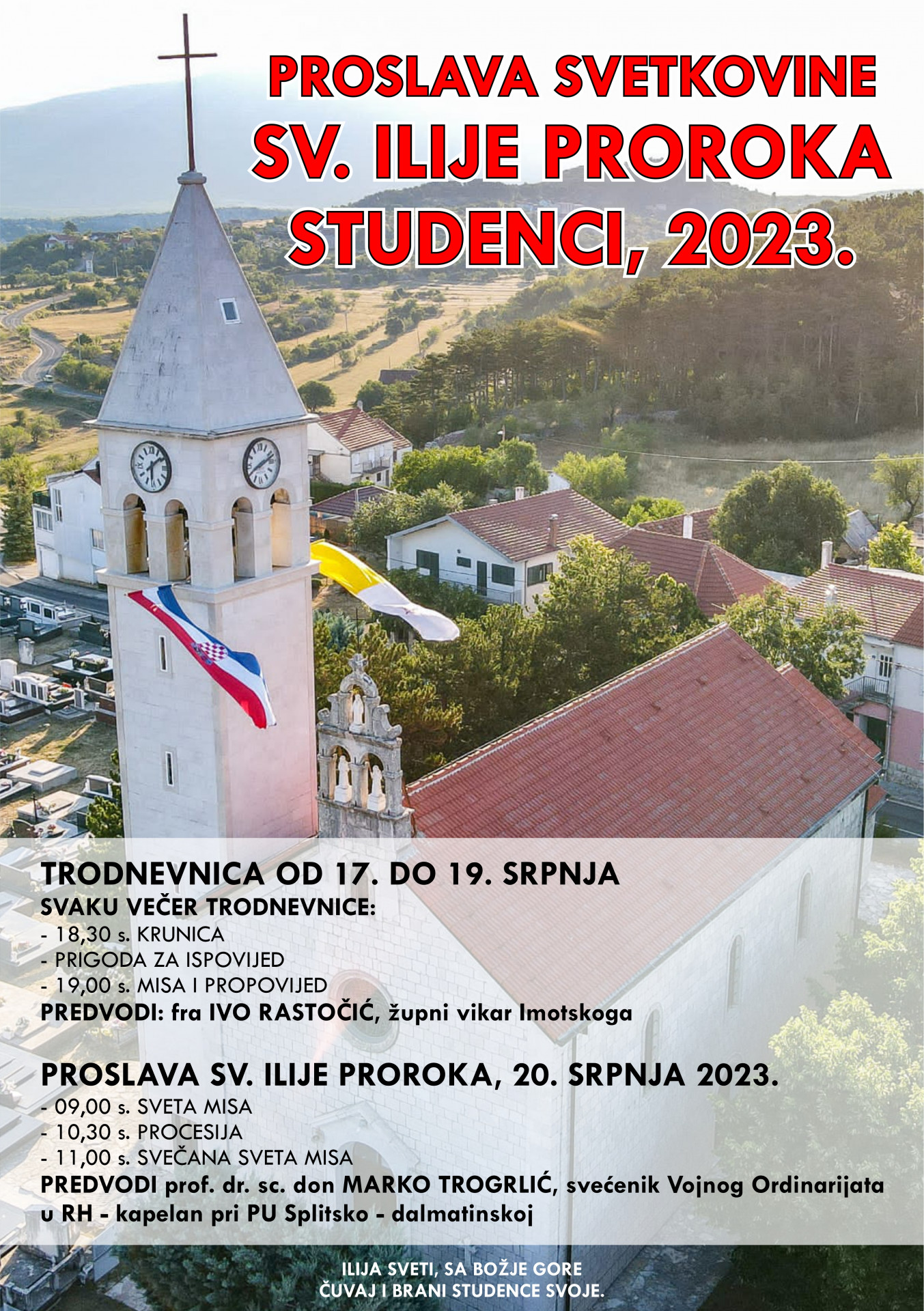 Svetkovina sv. Ilije Proroka skavi se 20. srpnja u župi Studenci kod Imotskoga. Misom u 9 sati predvodi fra Ivo Rastočić, župni vikar Imotskoga, a u 10:30 bit će procesija i svečana misa koju predvodi don Marko Trogrlić, svećenik Vojnog Ordinarijata u RH – kapelan pri PU Splitsko-dalmatinskoj. Proslavi prethodi trodnevnica od 17. do 19. srpnja, koju predvodi fra Ivo Rastočić, župni vikar Imotskoga.