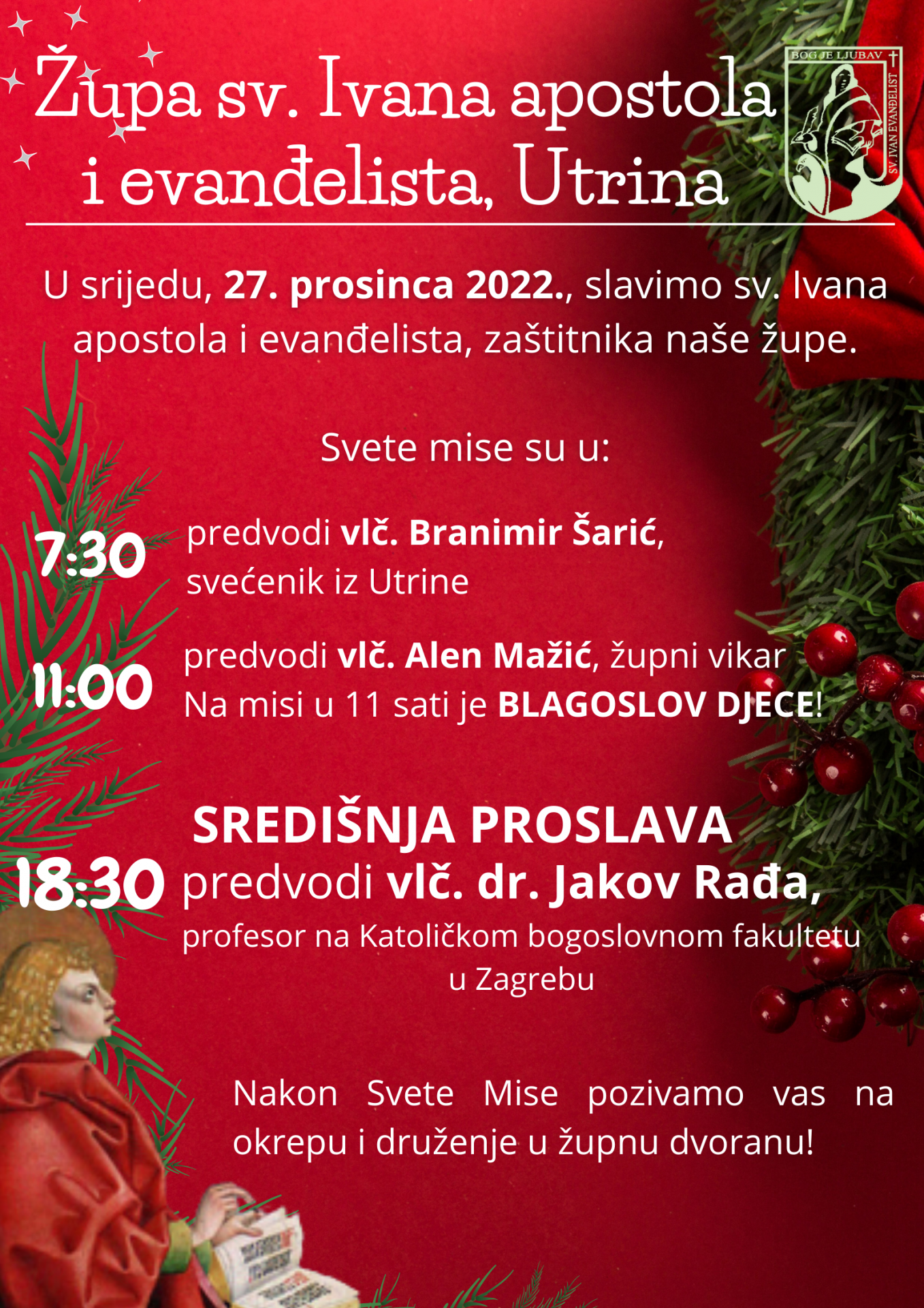 Župa sv. Ivana apostola i evanđelista u zagrebačkoj Utrini slavi 27. prosinca svetkovinu zaštitnika župe. Mise su u 7.30, 11 i 18.30.
