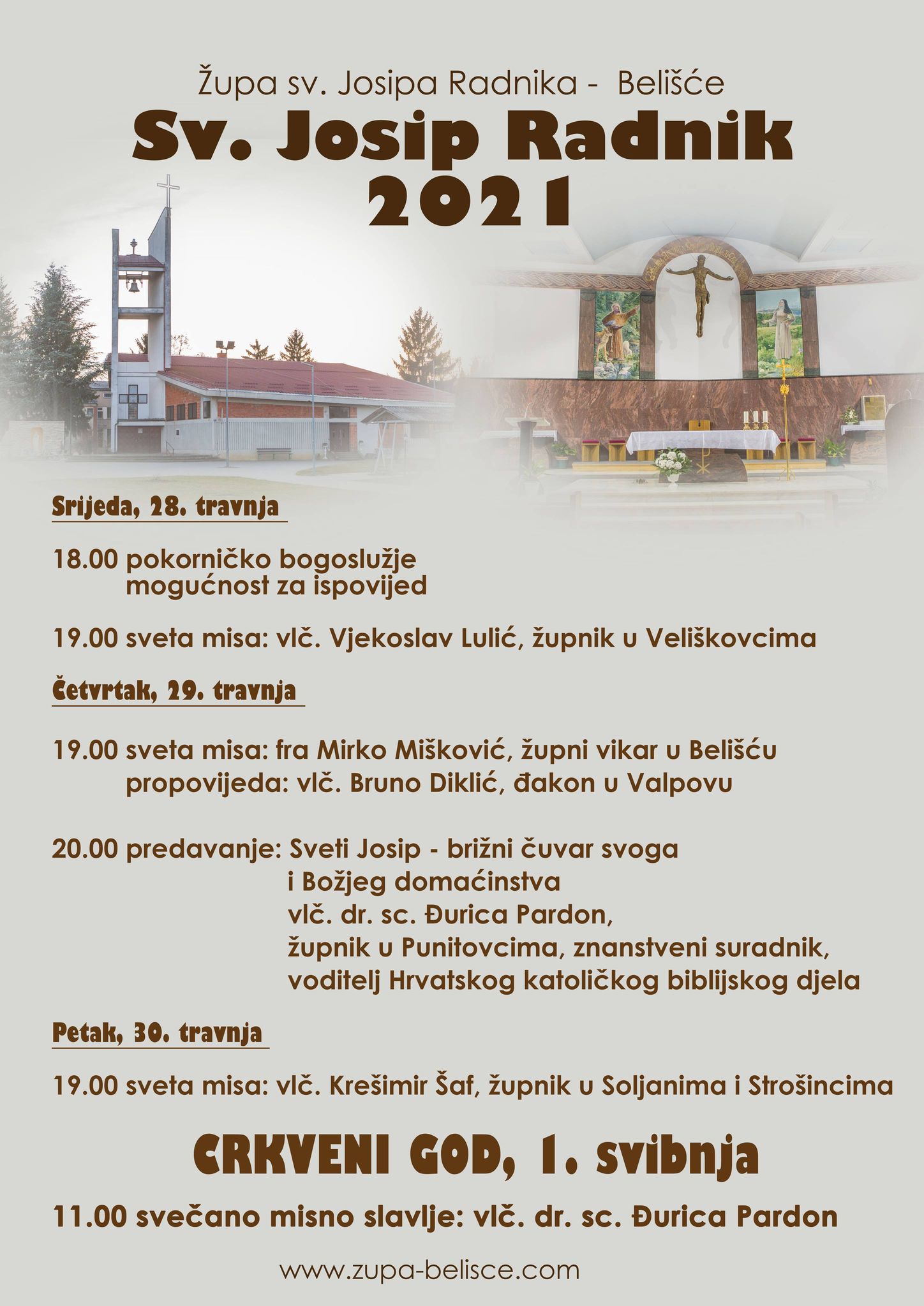 Župa sv. Josipa Radnika u Belišću svečano slavi crkveni god nebeskog zaštitnika te obljetnicu posvećenja župne crkve i samostana. Proslavi prethoditi trodnevnica koja će započeti pokorničkim bogoslužje u srijedu 28. travnja s početkom u 18 sati. Misna slavlja u dane trodnevnice su u 19 sati, a mogućnost za ispovijed je prije početka misnih slavlja.