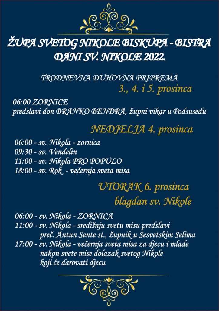 Župa sv. Nikole u proslavit će svetkovinu svog naslovnika u utorak 6. prosinca 2022. Mise će biti slavljene u 6, 11 i 17 sati.