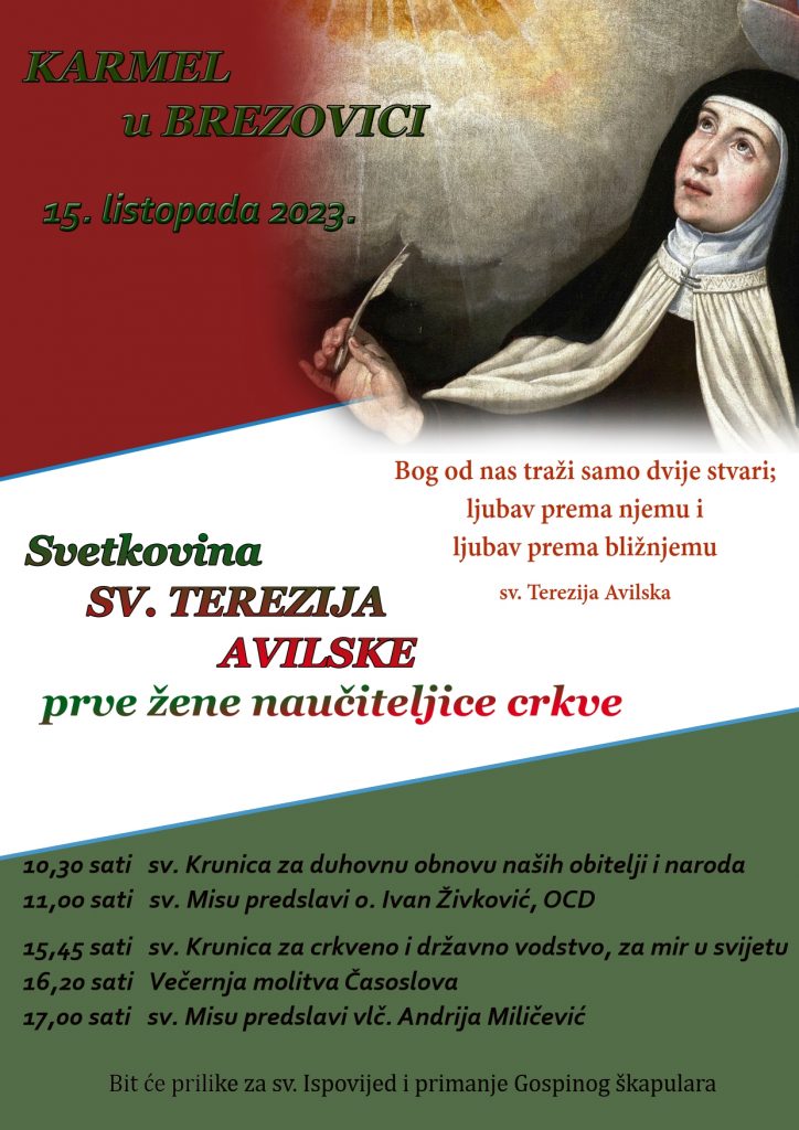 Svetkovina sv. Terezija Avilske bit će svečano proslavljena u nedjelju 15. listopada u Karmelu u Brezovici. U 10.30 molit će se krunica za duhovnu obnovu obitelji i naroda. Misno slavlje u 11 sati predvodi o. Ivan Živković, OCD. U 15.45 molit će se krunica za crkveno i državno vodstvo te za mir u svijetu. U 16.20 molit će se Večernja molitva Časoslova. Misno slavlje u 17 sati predslavit će vlč. Andrija Milićević. Tijekom dana bit će moguće pristupiti sakramentu ispovijedi te primiti Gospin škapular.