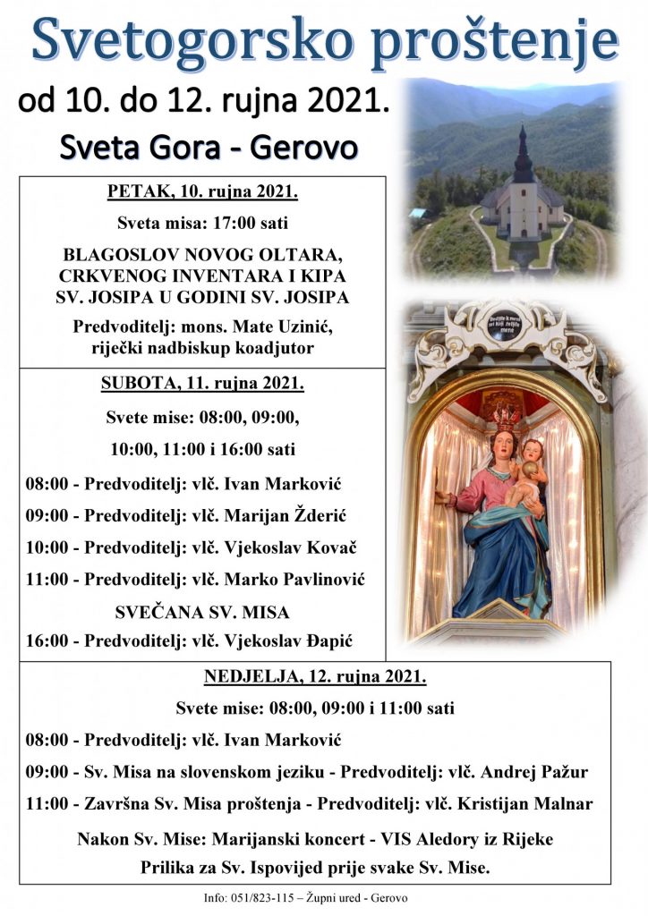U svetištu Majke Božje Karmelske na Svetoj Gori u petak 10. rujna započet će trodnevno proštenje Majci Božjoj Svetogorskoj. Svečano liturgijsko slavlje u 17 sati služit će riječki nadbiskup koadjutor Mate Uzinić i tom prigodom blagosloviti novi oltar, crkveni inventor i kip sv. Josipa, u Godini koja je na razini opće Crkve posvećena ovome svecu.