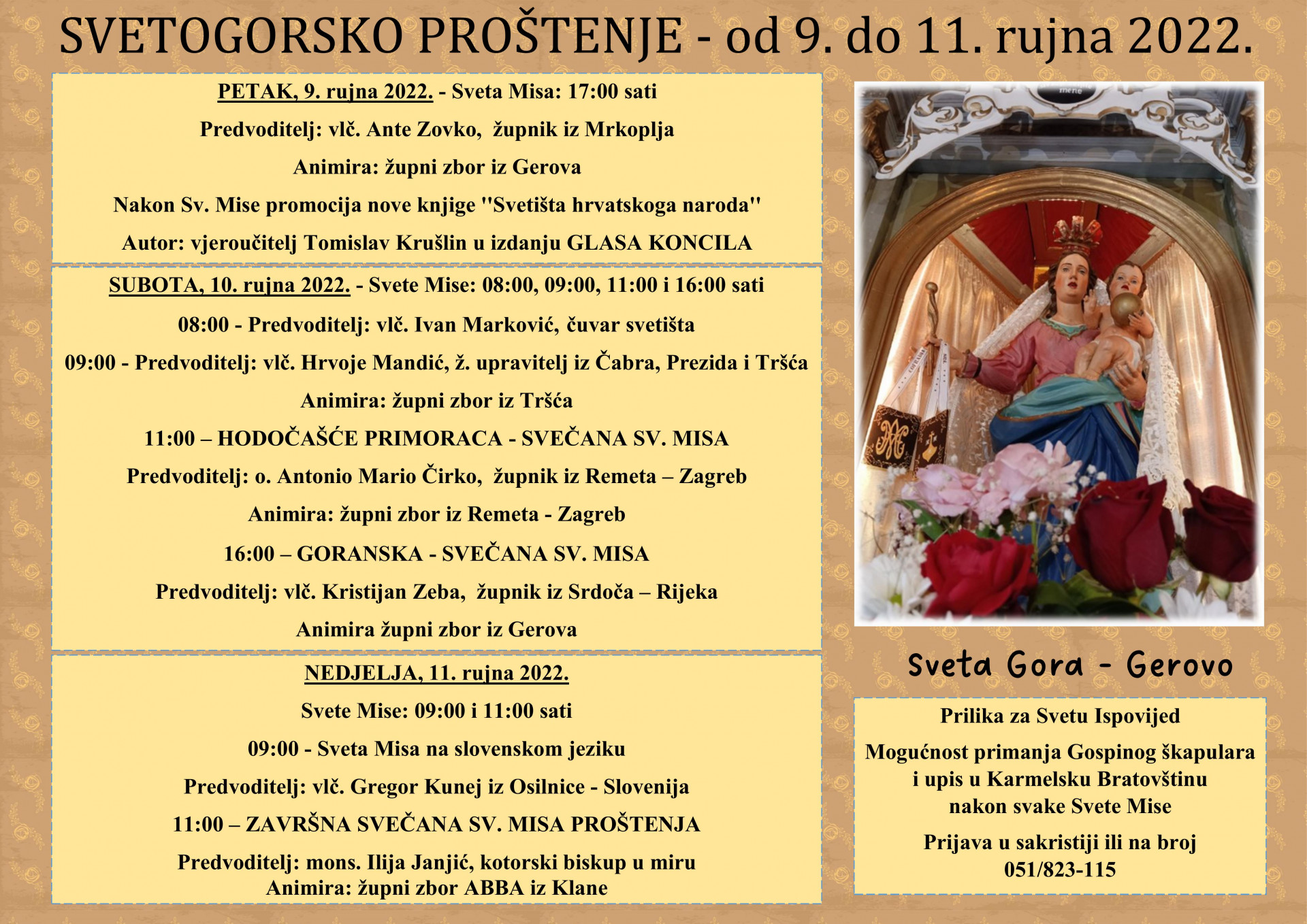 Svetogorsko proštenje (Sveta gora – Gerovo) održava se od 9. do 11. rujna 2022. U petak 9. rujna misa je u 17 sati. Predvodi je vlč. Ante Zovko, župnik iz Mrkoplja. Nakon mise bit će promocija nove knjige ”Svetišta hrvatskoga naroda” autora vjeroučitelja Tomislava Krušlina u izdanju Glasa Koncila.