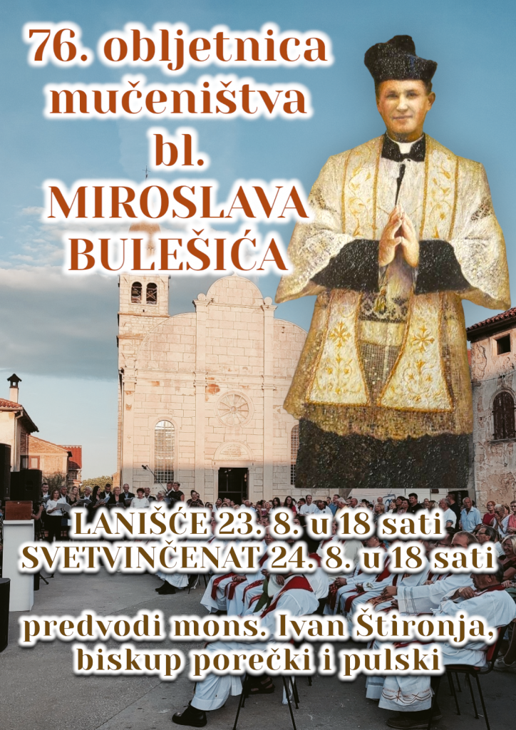 Svetvinčenat, (IKA) – U povodu 76. obljetnice mučeničke smrti blaženog Miroslava Bulešića u četvrtak 24. kolovoza održat će se svečano misno slavlje u 18 sati u Svetvinčentu. Euharistijsko slavlje predvodit će mjesni biskup Ivan Štironja, u zajedništvu s nad/biskupima Riječke metropolije i svećenicima.