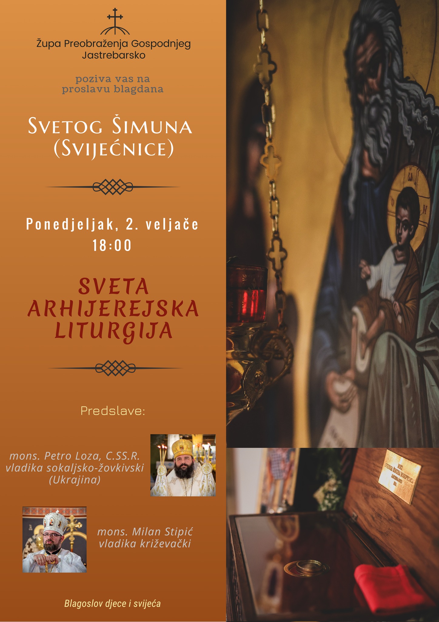 Na svetkovinu Susreta (Prikazanja) Gospodnjega u Hramu – Svjećnicu, u ponedjeljak 2. veljače u grkokatoličkoj crkvi Preobraženja Gospodnjega u Jastrebarskom, gdje se čuvaju moći sv. Šimuna Bogoprimca, u 18 sati služit će se svečana arhijerjeska liturgija s blagoslovom svijeća i djece. Liturgiju će predvoditi vladika Petro Loza, grkokatolički biskup sokaljsko-žovkivski iz Ukrajine i vladika Milan Stipić, biskup križevački.