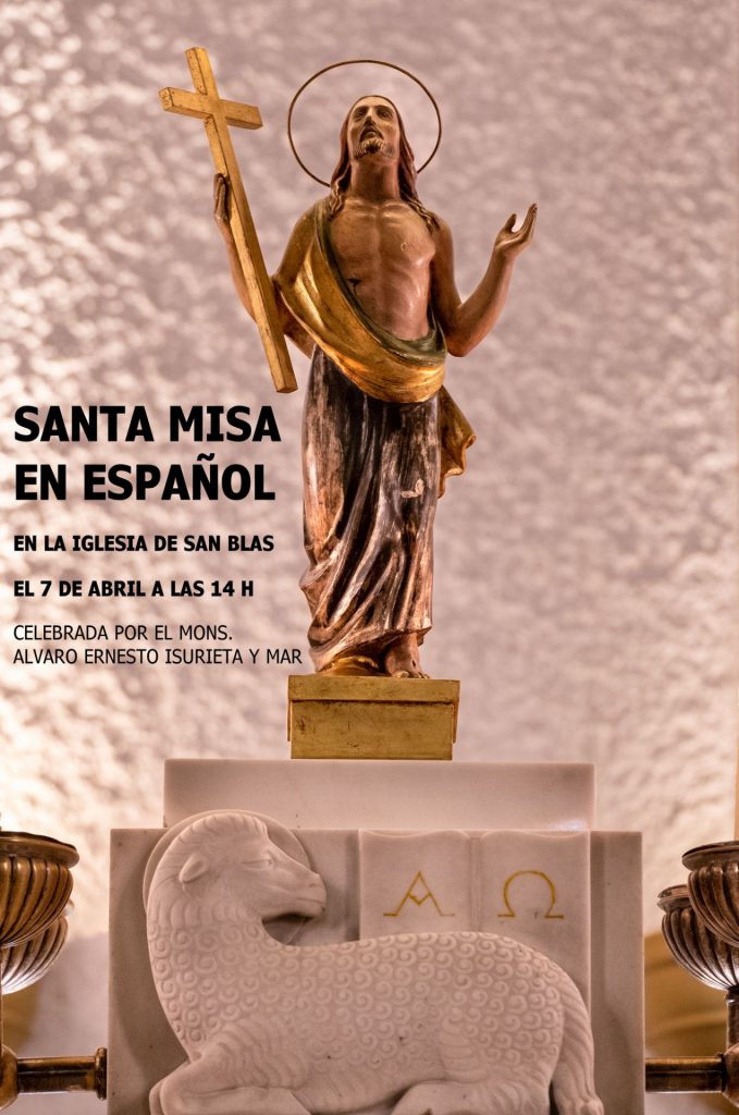 Zagreb, (IKA) – Misa na španjolskom jeziku slaviti će se na nedjelju Božjega milosrđa, 7. travnja u 14 sati u crkvi svetoga Blaža u Zagrebu. Prije te mise slaviti će se i redovna nedjeljna misa na engleskom jeziku u 12:30. Misu na španjolskom jeziku će predvoditi prvi tajnik Apostolske nuncijature u Hrvatskoj mons. Alvaro Ernesto Izurieta Y Sea.