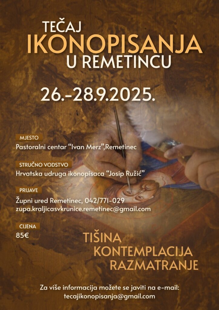 Župa Blažene Djevice Marije Kraljice Svete Krunice u Remetincu organizira tečaj ikonopisanja koji će se održati od 26. do 28. rujna u Pastoralnom centru „Ivan Merz“ uz župnu crkvu u Remetincu.