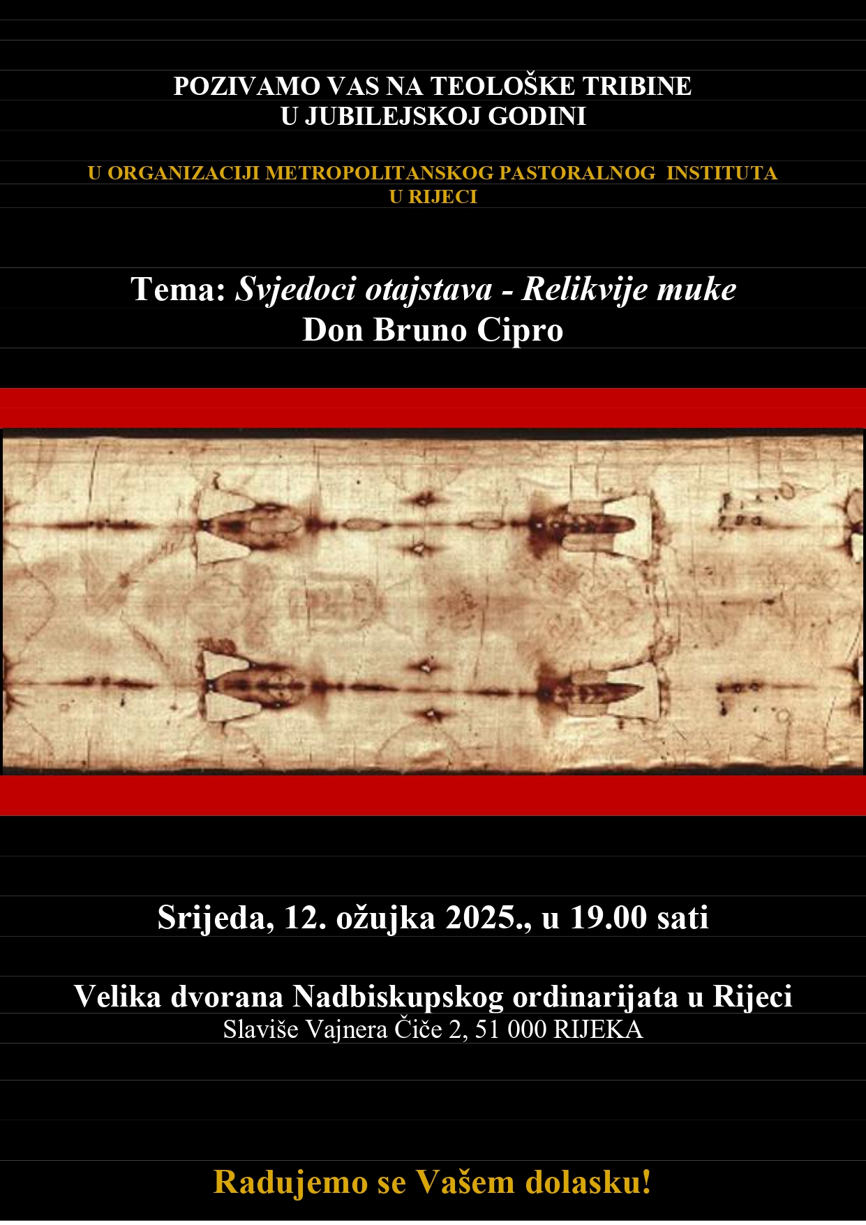 Teološka tribina o temi „Svjedoci otajstava – Relikvije muke“ bit će održana u srijedu 12. ožujka u Velikoj dvorani Nadbiskupskog ordinarijata u Rijeci. O temi će govoriti don Bruno Cipro, a početak je u 19 sati.