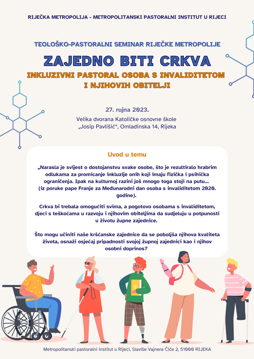Teološko-pastoralni seminar Riječke metropolije na temu “Zajedno biti Crkva – Inkluzivni pastoral osoba s invaliditetom i njihovih obitelji” održat će se 27. rujna u Velikoj dvorani Katoličke osnovne škole “Josip Pavlišić”. Početak je u 9 sati.