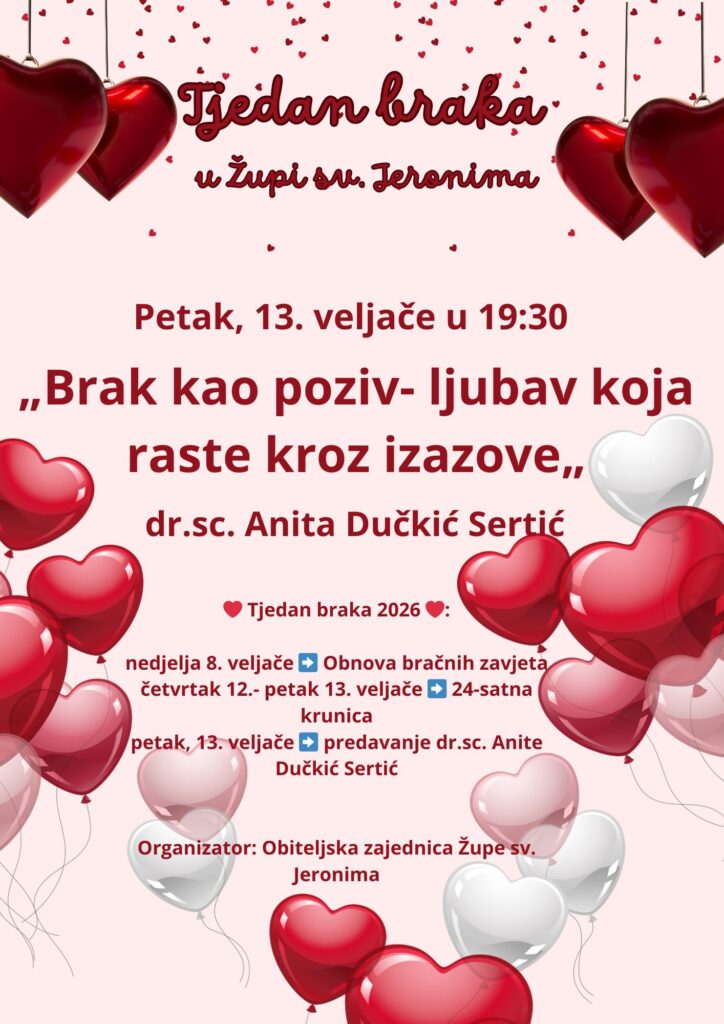 U sklopu Tjedna braka u Župi sv. Jeronima u Zagrebu održat će u petak 13. veljače s početkom u 19.30 predavanje „Brak kao poziv – ljubav koja raste kroz izazove“ dr. sc. Anite Dučkić Sertić.