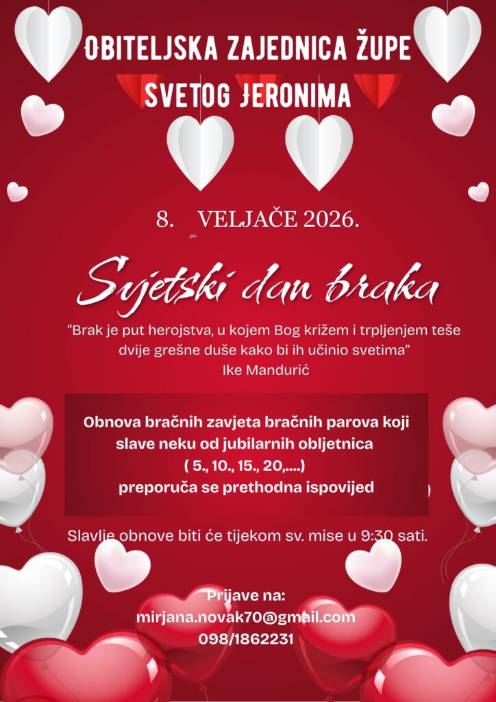 U sklopu Tjedna braka održat će se i obnova bračnih zavjeta tijekom mise u 9.30 u nedjelja 8. veljače za bračne parove koji u ovoj godini obilježavaju neku od jubilarnih godišnjica braka (5, 10, 15, 20 i više godina).
