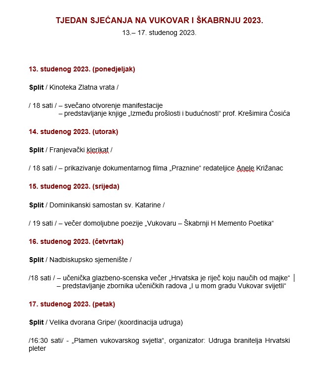 Manifestacija Tjedan sjećanja na Vukovar i Škabrnju 2023. održat će se u Splitu od ponedjeljka, 13. studenog 2023. do petka, 17. studenog 2023. u organizaciji Hrvatske udruge ‚Benedikt‘.
