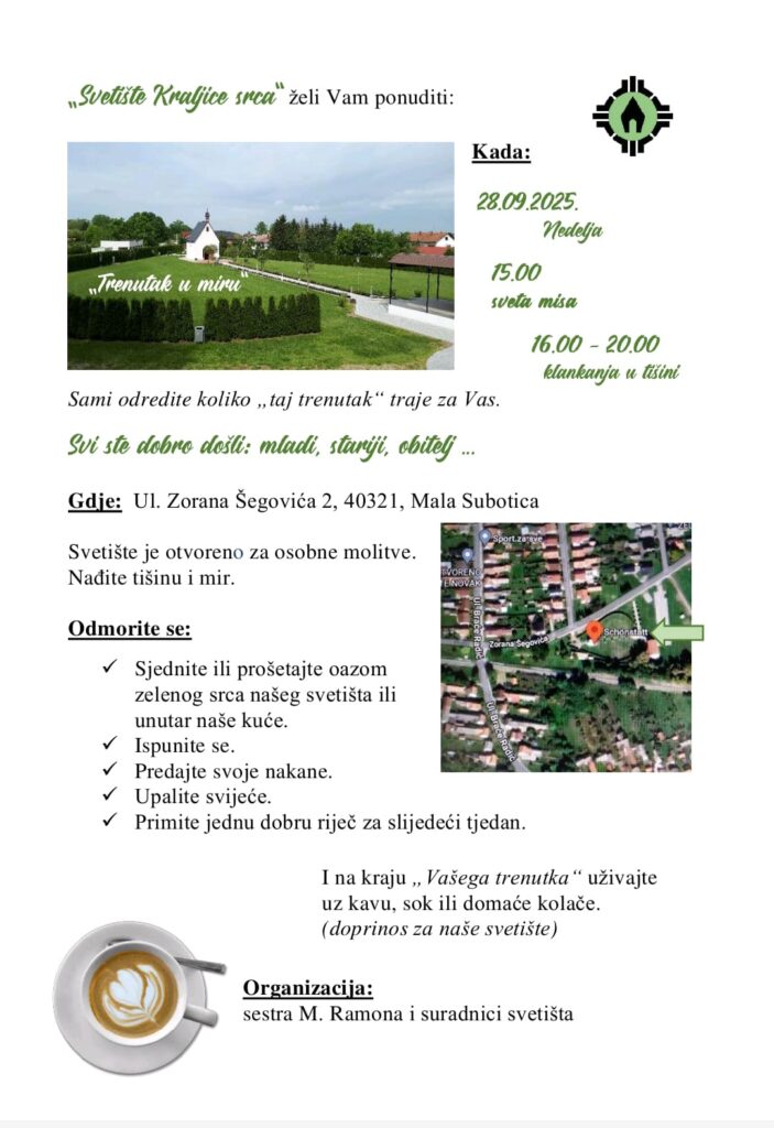 Svetište Kraljice srca u Maloj Subotici Hrvatske schönstattske obitelji nudi u nedjelju 28. rujna „Trenutak u miru“. U 15 sati u svetištu će biti euharistijsko slavlje, a potom od 16 do 20 sati euharistijsko klanjanje Presvetom Oltarskom Sakaramentu u tišini. Svatko za sebe određuje koliko taj „Trenutak u miru“ traje, jer je taj dan svetište otvoreno za osobne molitve.