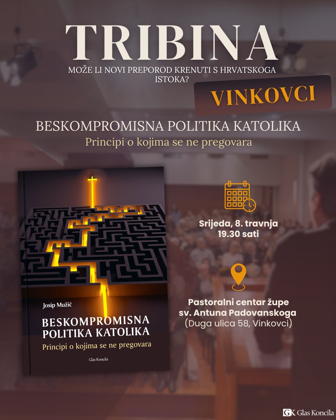 Tribinu „Može li novi preporod krenuti s hrvatskoga istoka?“ uz objavljenu knjigu svećenika profesora moralne teologije dr. Josipa Mužića „Beskompromisna politika katolika – Principi o kojima se ne pregovara“ održat će se u srijedu 8. travnja u 19.30 sati u crkvi sv. Antuna Padovanskoga u Vinkovcima (Duga ulica 58)u organizaciji Glasa Koncila.