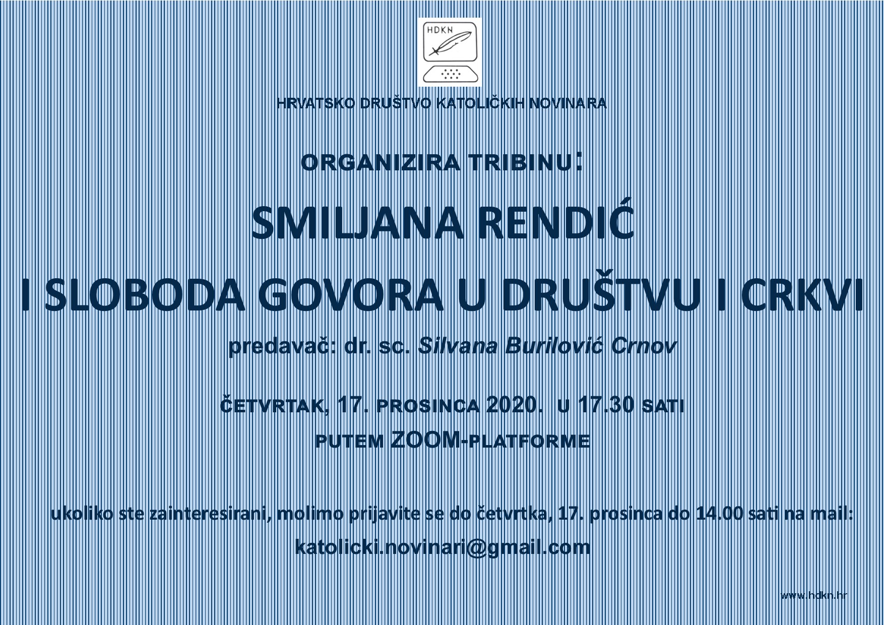 Hrvatsko društvo katoličkih novinara priređuje tribinu “Smiljana Rendić i sloboda govora u društvu i Crkvi” u četvrtak 17. prosinca s početkom u 17.30 sati.