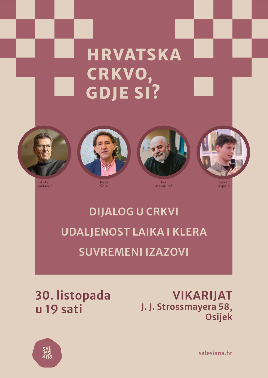 OSIJEK (IKA) – U prostorijama Vikarijata u Osijeku (J. J. Strossmayera 58) u subotu 30. listopada s početkom u 19 sati održat će se tribina naslova „Hrvatska Crkvo, gdje si?“.