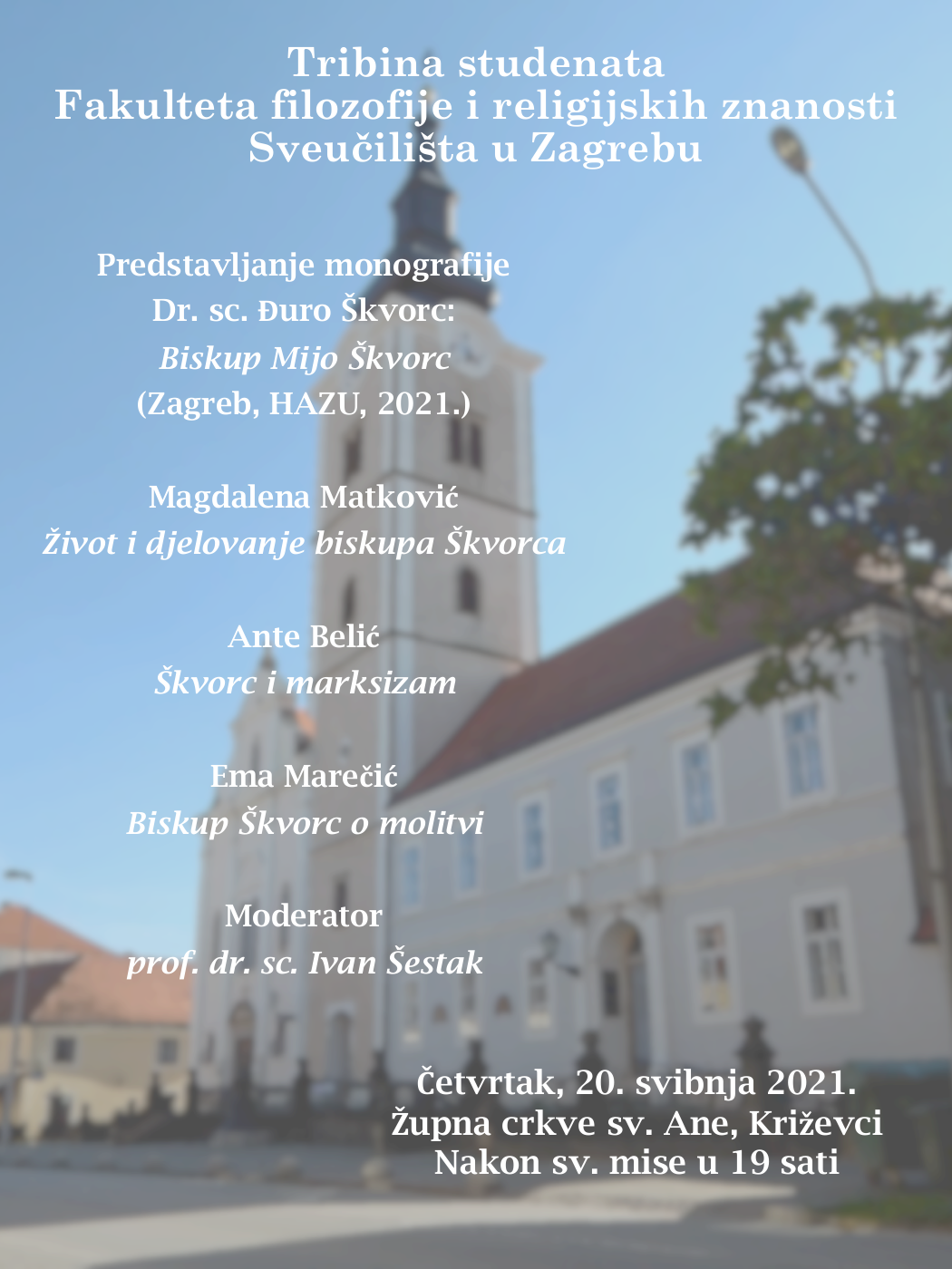 U četvrtak 20. svibnja nakon mise u 19 sati, u crkvi sv. Ane održat će se tribina studenata Fakulteta filozofije i religijskih znanosti Sveučilišta u Zagrebu o biskupu Miji Škvorcu.