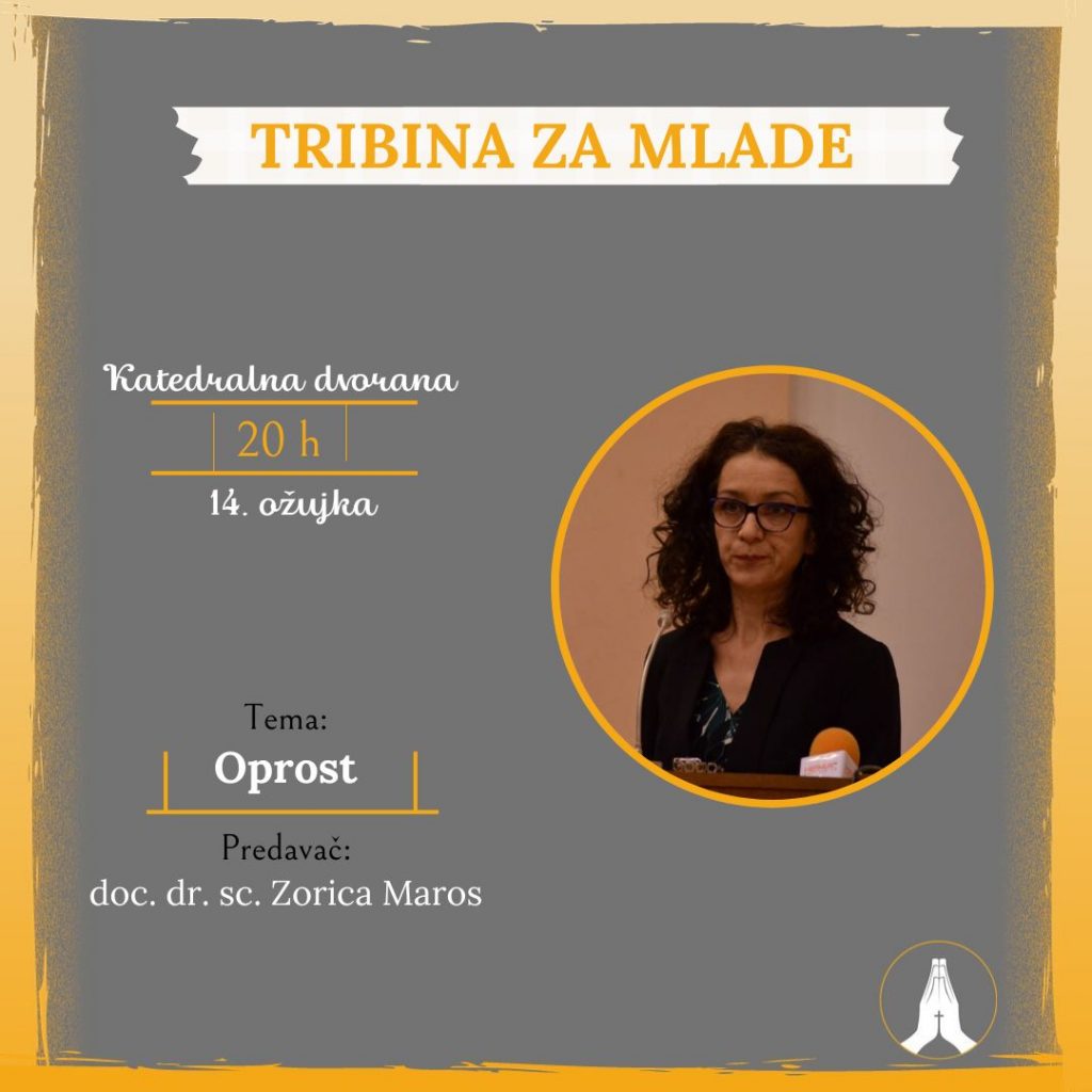 Predavanje „Oprost“ održat će doc. dr. sc. Zorica Maros, profesorica na Katoličkome bogoslovnom fakultetu Univerziteta u Sarajevu.