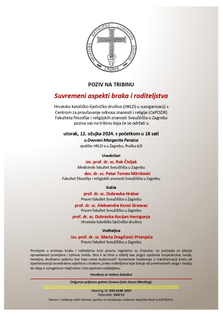 Zagreb, (IKA) – Hrvatsko katoličko liječničko društvo (HKLD) u suorganizaciji s Centrom za proučavanje odnosa znanosti i religije (CePOZiR) Fakulteta filozofije i religijskih znanosti Sveučilišta u Zagrebu organizira tribinu „Suvremeni aspekti braka i roditeljstva“ u utorak, 12. ožujka u 18 sati u Dvorani Margarita Peraica u sjedištu HKLD-a u Zagrebu, Praška 6/II.
