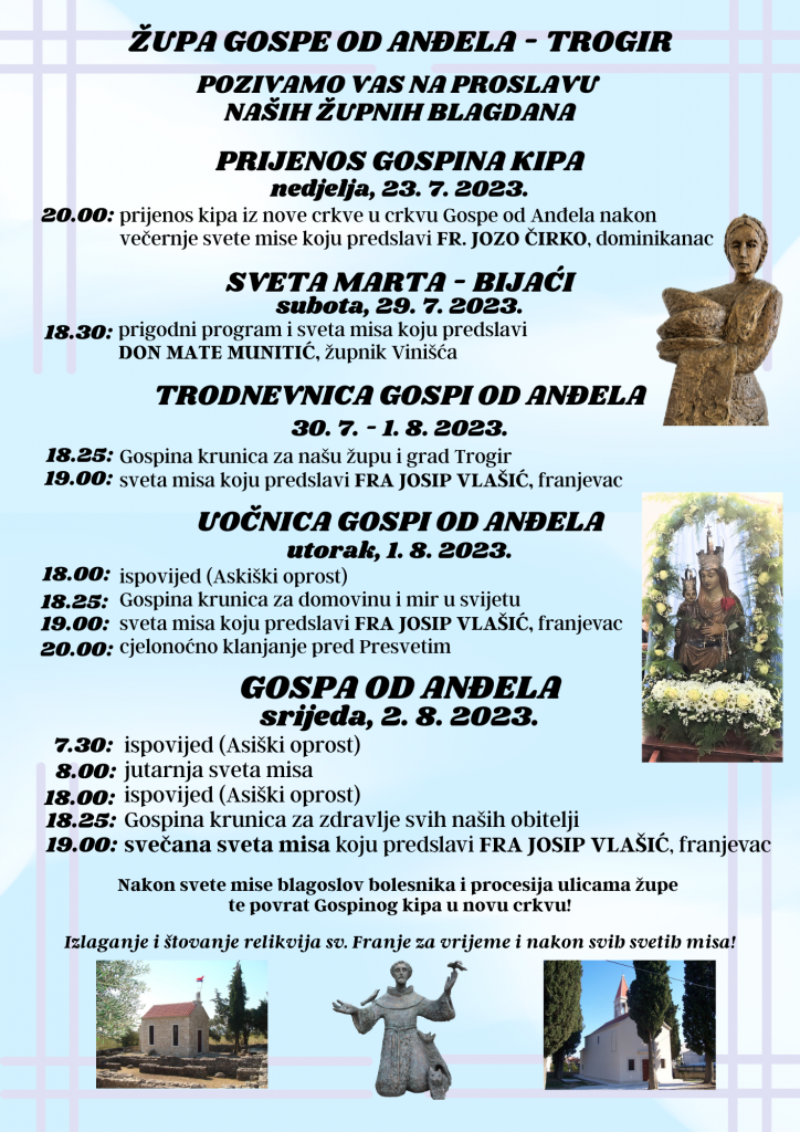 Od 30. srpnja do 1. kolovoza će se u crkvi Gospe od Anđela u Trogiru slaviti trodnevna priprema za proslavu blagdana zaštitnice župe. Svakog dana vjernici će imati priliku za ispovijed u 18 sati. Od 18:25 će se moliti Gospina krunica, a misa će svake večeri biti slavljena u 19 sati. Mise će sva tri dana predslaviti voditelj Franjevačke kuće molitve Masna Luka fra Josip Vlašić. Posljednjeg dana trodnevnice u crkvi će cijelu noć biti izložen Presveti Oltarski Sakrament te će vjernici moći doći i pomoliti se Gospodinu na vlastite nakane.
