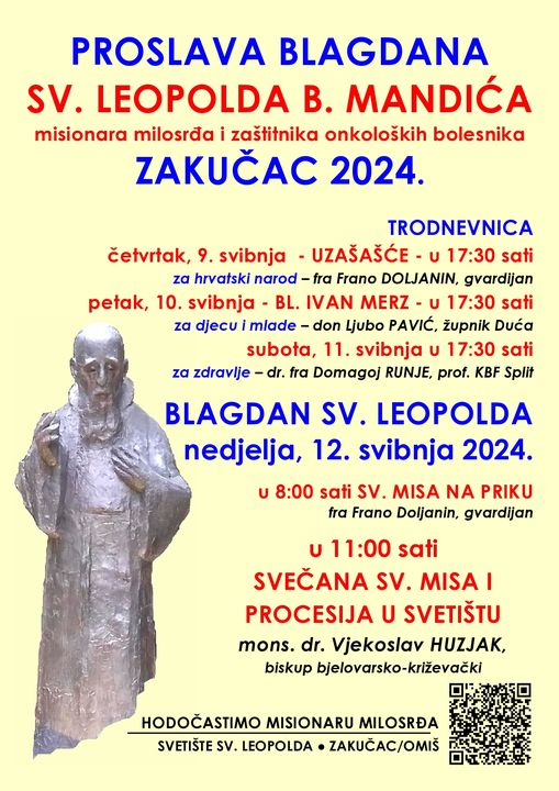 Blagdan sv. Leopolda Bogdana Mandića u njegovom Svetištu u Zakučcu bit će proslavljen u nedjelju 12. svibnja 2024. Središnje euharistijsko slavlje u 11 sati i procesiju predvodit će bjelovarsko-križevački biskup Vjekoslav Huzjak. Misno slavlje bit će i u 8 sati.