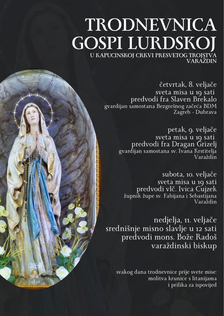 Varaždinski kapucini za blagdan Blažene Djevice Marije Lurdske pripravljaju se trodnevnicom koja će početi u četvrtak, 8. veljače 2024. Misu u 19 sati predvodit će gvardijan Samostana Bezgrešnog začeća Blažene Djevice Marije u zagrebačkoj Dubravi fra Slaven Brekalo, OFM.