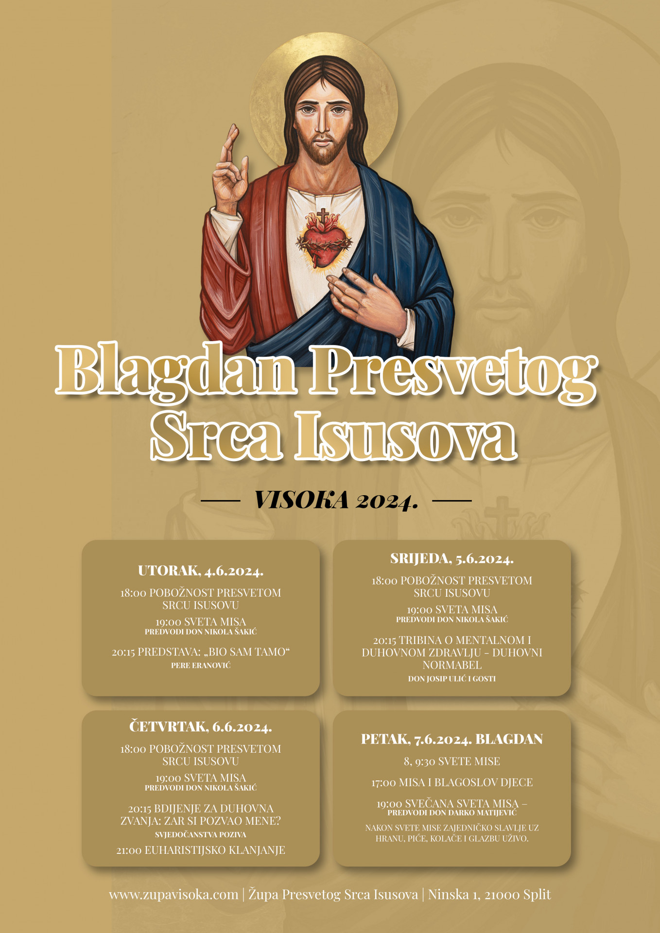 Svetkovina Presvetog Srca Isusova u župi Visoka bit će 7. lipnja. Mise će biti u 8, 9:30 i 17 sati. Svečanu misu u 19 sati predvodi don Darko Matijević. Proslavi župne svetkovine prethodit će trodnevnica.