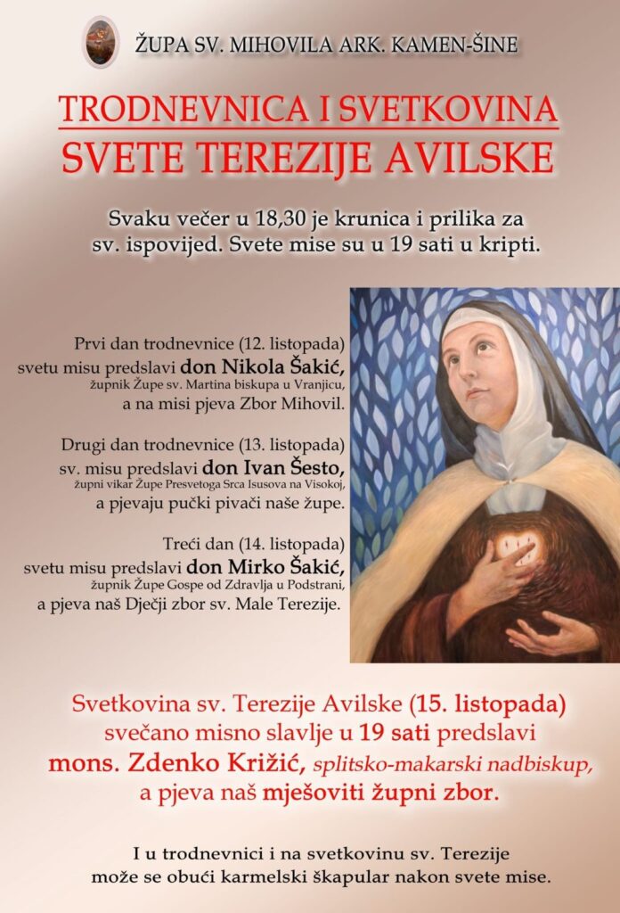 U Župi sv. Mihovila arkanđela na Kamen-Šinama započinje trodnevnica uoči svetkovine sv. Terezije Avilske, koja će se svečano proslaviti u srijedu, 15. listopada. Svakoga dana trodnevnice molit će se krunica u 18.30, uz mogućnost za svetu ispovijed, dok će svete mise biti u 19 sati u kripti.