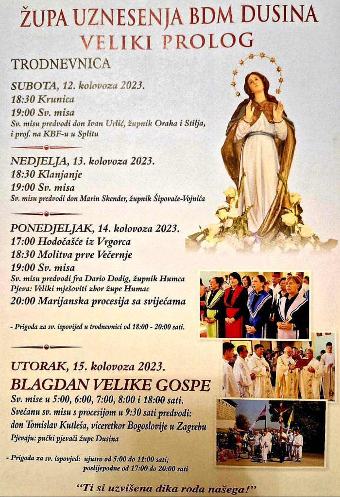 Na župnu svetkovinu Velike Gospe, u utorak 15. kolovoza 2023., u Velikom Prologu bit će slavljeno šest misa: u 5, 6, 7, 8, 9:30 i 18 sati. Središnju misu s procesijom u 9:30 predslavi vicerektor Centralnog bogoslovnog sjemeništa u Splitu vlč. Tomislav Kutleša.