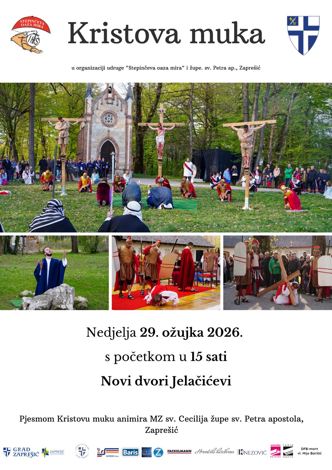 Uprizorenje Kristove Muke održat će se na Nedjelju Muke Gospodnje – Cvjetnicu, 29. ožujka, u perivoju Novih dvora u Zaprešiću s početkom u 15 sati. Udruga „Stepinčeva oaza mira“ u suradnji sa Župom sv. Petra apostola – Zaprešić I. organizira ovaj simbolični izričaj dvadeset i prvi put od 2010. kojim članovi Udruge i župe prikazuju posljednja dva dana Isusova života na Veliki četvrtak i Veliki petak.