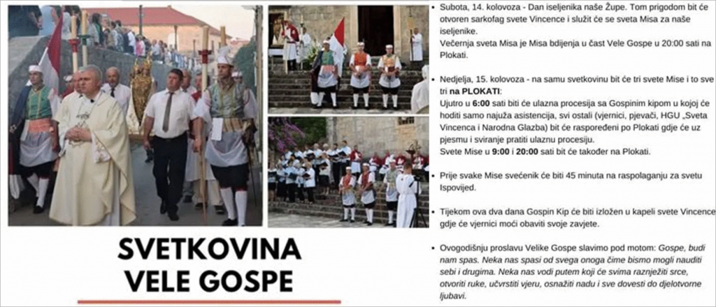 Na svetkovinu Velike Gospe u nedjelju 15. kolovoza slavit će se tri mise u 6 sati, u 9 sati i u 20 sati, a sva misna slavlja bit će na plokati ispred župne crkve.