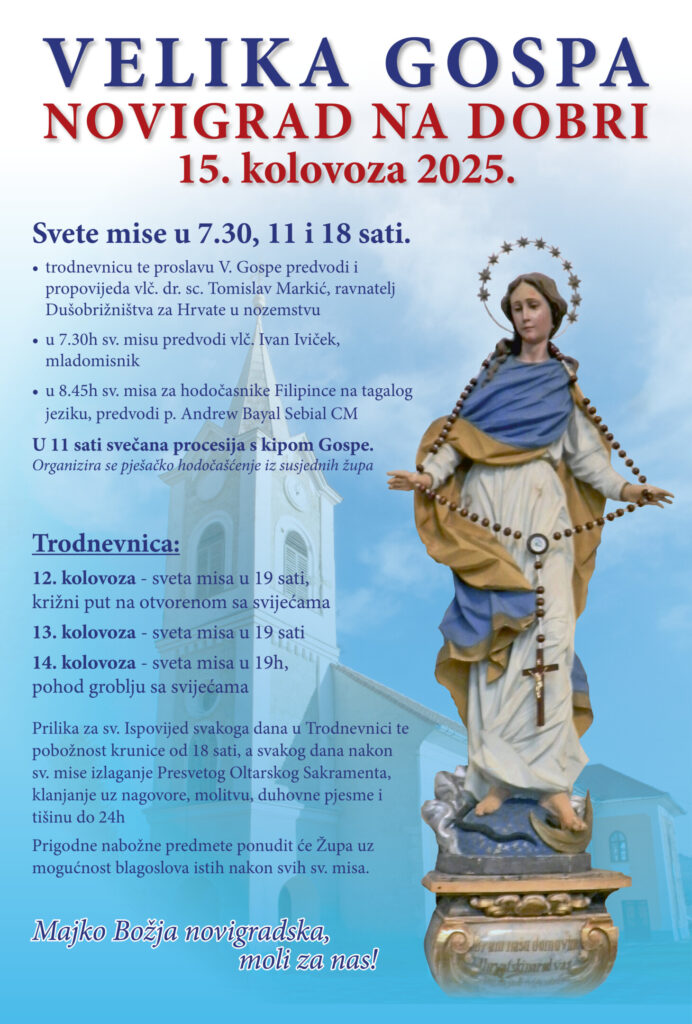 Župa BDM Snježne u Novigradu na Dobri proslavit će svetkovinu Velike Gospe 15. kolovoza misama u 7:30 koju će predvoditi mladomisnik Ivan Iviček, u 8:45 za hodočasnike Filipince na tagalog jeziku koju će slaviti o. Andrew Bayal Sebial, CM, središnjom u 11 te popodnevnom u 18 sati.