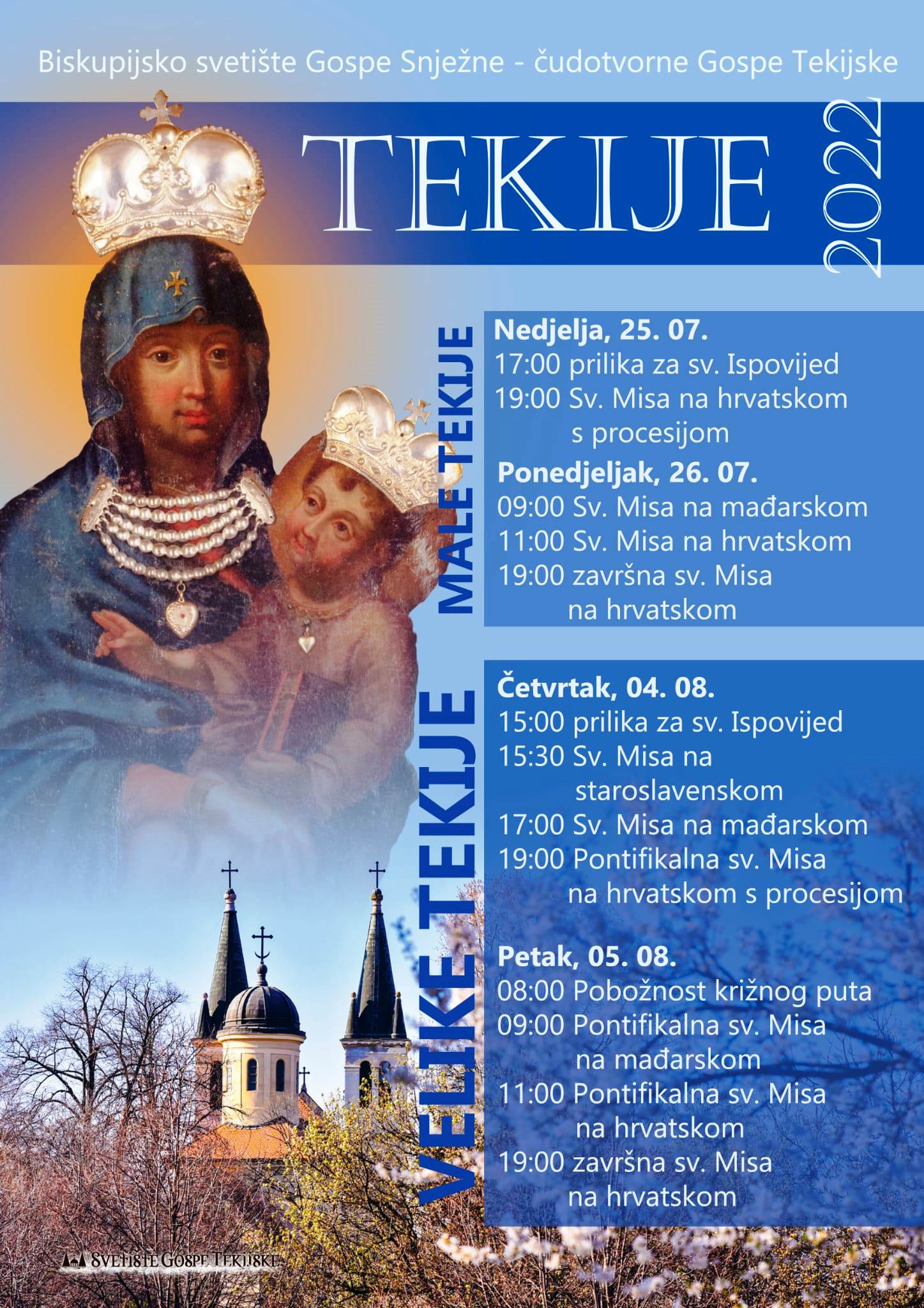 Biskupijsko svetište Gospe Snježne na Tekijama u Petrovaradinu ove godine će svečano proslaviti blagdan Snježne Gospe (Velike Tekije) bogoslužjem na više jezika, procesijom, pobožnosti križnoga puta i ispunjavanjem zavjeta koje su vjernici obećali izvršiti svjedočeći na taj način svoju vjeru u Trojedinog Boga i vjernost Majci Božjoj.