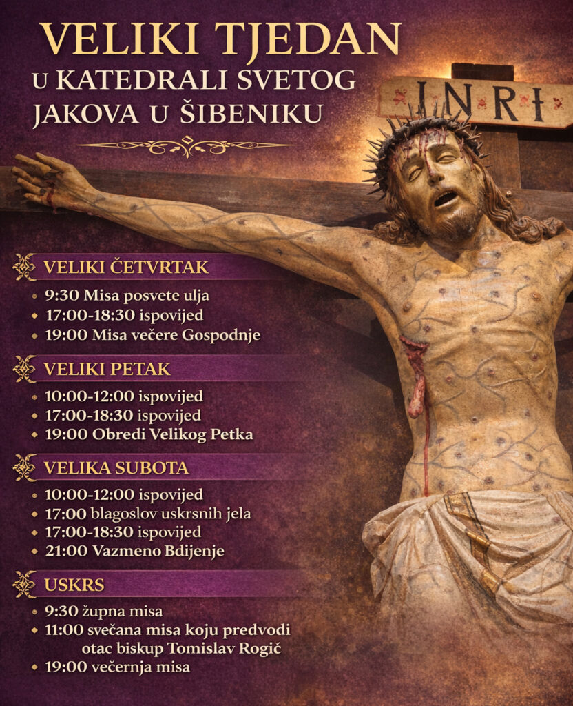 U katedrali sv. Jakova u Šibeniku na Veliki četvrtak 2. ožujka u 9.30 slavit će se misa posvete ulja, dok će se Misa večere Gospodnje slaviti u 19 sati. Od 17 do 18.30 bit će prilika za ispovijed.