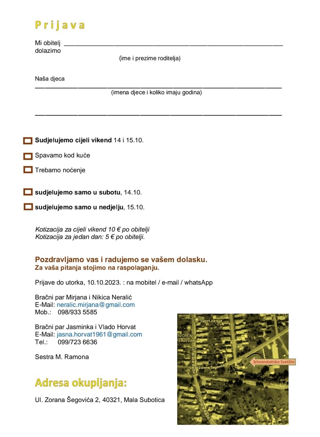 Svetište Kraljice srca u Maloj Subotici Hrvatske schönstattske obitelji organizira „Vikend za obitelj“ u subotu 14. i nedjelju 15. listopada 2023.