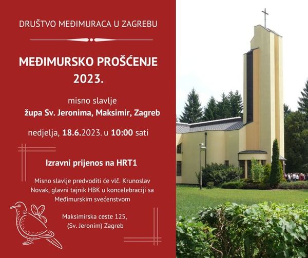 U organizaciji Društva Međimuraca u Zagrebu u Župi sv. Jeronima u zagrebačkom Maksimiru u nedjelju 18. lipnja održat će se Međimorsko prošćenje. Misu u 10 sati predvodi generalni tajnik HBK doc. dr. sc. vlč. Krunoslav Novak u zajedništvu s međimurskim svećenicima.