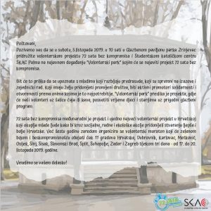 U Glazbenom paviljonu parka Zrinjevac u subotu 5. listopada u 10 sati održat će se najavno događanje “Volonterski park” kojim će se najaviti najveći volonterski projekt u Hrvatskoj 72 sata bez kompromisa.