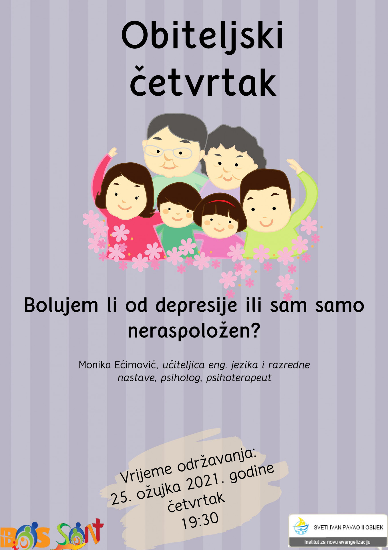 U drugom ciklusu predavanja „Obiteljskoga četvrtka“, kojega organizira Bračno i obiteljsko savjetovalište Đakovačko-osječke nadbiskupije, Institut za novu evangelizaciju „Sveti Ivan Pavao II.“ i Povjerenstvo za brak i obitelj osječkih dekanata, u četvrtak 25. ožujka 2021. u 19:30 održat će se webinar putem ZOOM platforme o temi Bolujem li od depresije ili sam samo neraspoložen? O temi će govoriti učiteljica engleskog jezika i razredne nastave, psihologinja i psihoterapeutkinja Monika Ećimović.