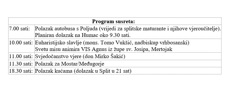 XXII. Međubiskupijski susret maturanata održat će se 16. ožujka 2024. u Bosni i Hercegovini (Humac, Međugorje, Mostar). Misno slavlje na Humcu u 10 sati predvodit će vrhbosanski nadbiskup Tomo Vukšić.