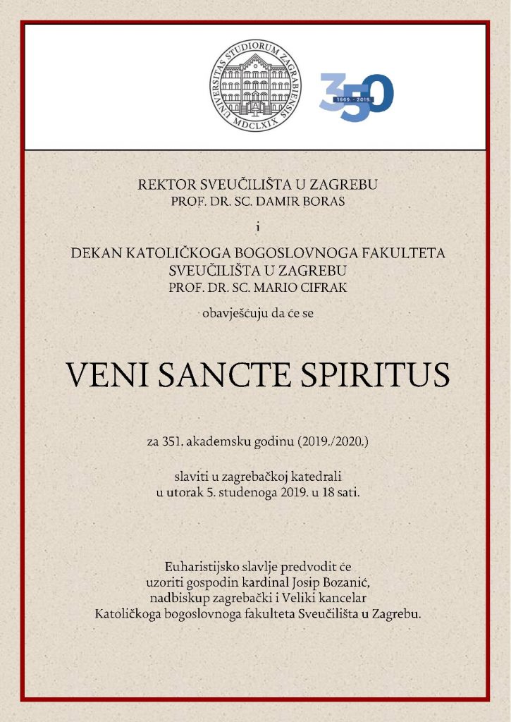 Zagrebački nadbiskup kardinal Josip Bozanić, Veliki kancelar Katoličkoga bogoslovnog fakulteta Sveučilišta u Zagrebu, predvodit će u utorak 5. studenoga s početkom u 18 sati u zagrebačkoj katedrali svečanu euharistiju sa zazivom Duha Svetoga za početak akademske godine 2019./2020.