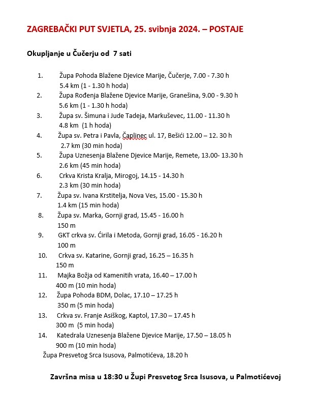Zagrebački put svjetla održat će se u subotu, 25. svibnja 2024. godine. Početak okupljanja je u 7 sati u Čučerju. Put svjetla će završiti misnim slavljem u 18:30 u Župi Presvetog Srca Isusova u Zagrebu (Palmotićeva ulica 31).