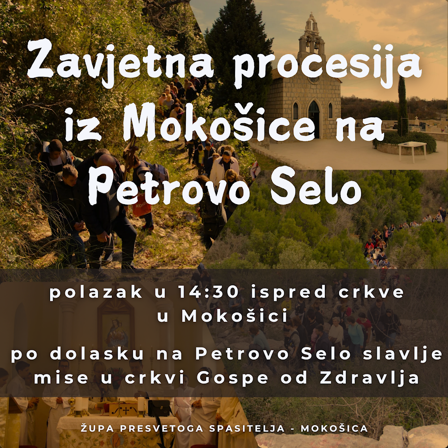 Procesija će krenuti u 14.30 s okupljanjem i blagoslovom ispred župne crkve Presvetog Spasitelja u Mokošici te će se po dolasku na Petrovo Selo u crkvi Gospe od Zdravlja slaviti misa.
