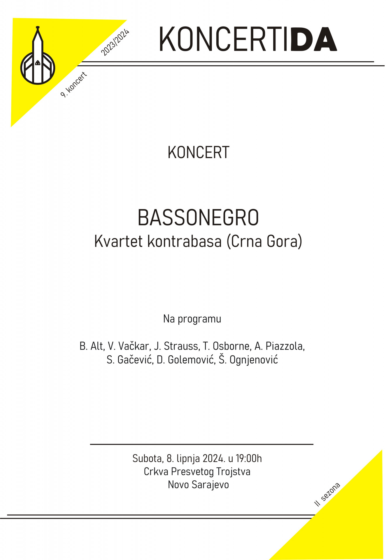 Posljednji koncert iz druge sezone „KoncertiDA“ kojega organizira župa Presvetog Trojstva u Novom Sarajevu održat će se u subotu, 8. lipnja s početkom u 19 sati u istoimenoj crkvi. Na njemu će nastupiti kvartet kontrabasa „Bassonegro“ iz Crne Gore.