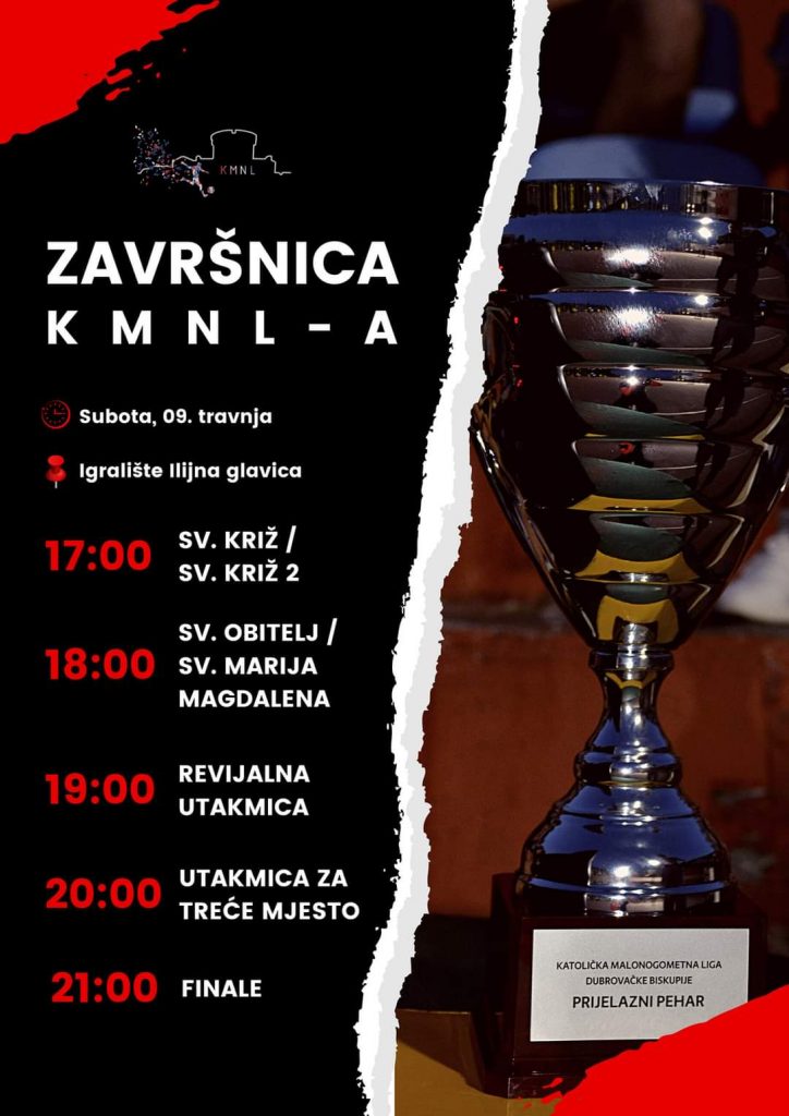 Dubrovnik, (IKA) – Završnica Katoličke malonogometne lige Dubrovačke biskupije igrat će se u subotu, 9. travnja na igralištu na Ilijinoj glavici u Dubrovniku.