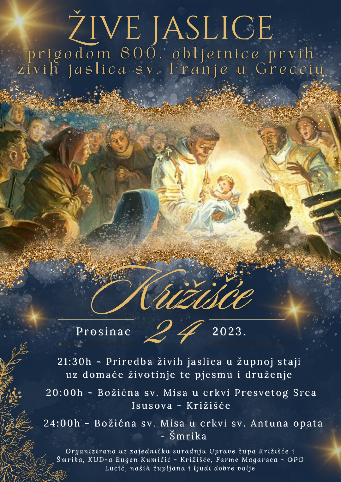 Prigodom obljetnice 800. godine od prvih živih jaslica koje je pripremio sv. Franju u gradiću Grecciu, župe Križišće i Šmrike pripremaju uprizorenje živih jaslica. Božićna misa služit će se 24. prosinca u 20 sati navečer u župnoj crkvi Presvetog Srca Isusova u Križišću, a nakon mise, u 21.30 sati pored župne kuće, kod štale, započinje priredba živih jaslica. Vrijeme nakon uprizorenje jaslica bit će ispunjeno druženjem i pjesmom.