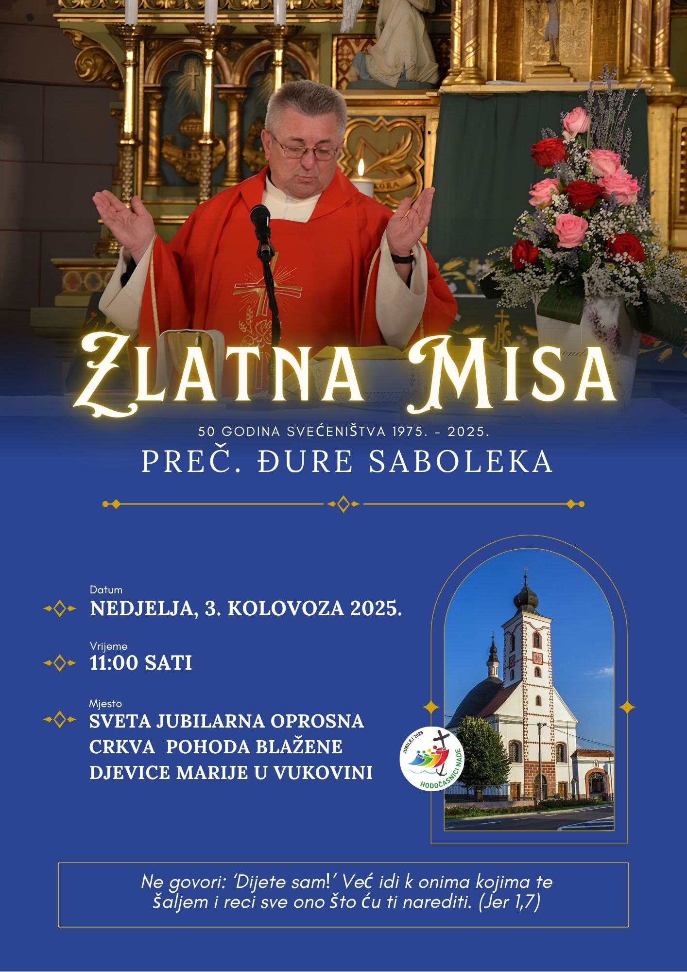 Preč. Đuro Sabolek proslavit će zlatnu misu u nedjelju, 3. kolovoza s početkom u 11 sati u župnoj crkvi Pohoda Blažene Djevice Marije u Vukovini, koja je ove godine od zagrebačkog nadbiskupa Dražena Kutleše proglašena svetim jubilejskim mjestom, crkva za dobivanje potpunog oprosta, a gdje je preč. Đuro Sabolek služio 37 godina. Na svetoj misi propovijedat će domaći sin župe Vukovina, preč. Ivan Vučak, upravitelj župa Krašić, Oštrc i Gornje Prekrižje te dekan Jastrebarskog dekanata!