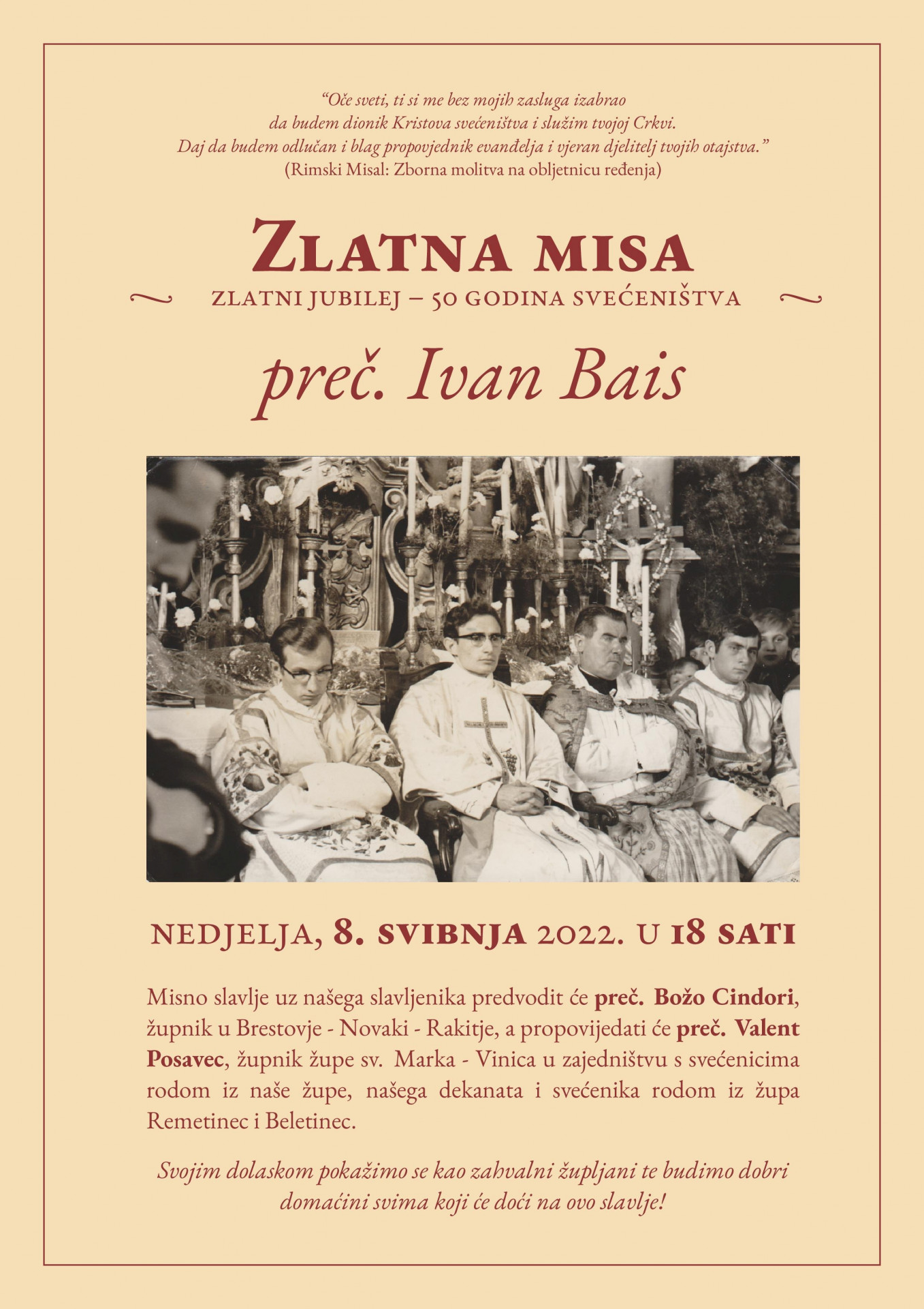 Preč. Ivan Bais, umirovljeni svećenik i umirovljeni kanonik Zbornog kaptola, te dugogodišnji župnik Župe Remetinec i Župe Beletinec proslavit će 50 godina svećeništva, Zlatnu misu, u nedjelju 8. svibnja u 18 sati u Župi sv. Elizabete Ugarske u Jalžabetu.